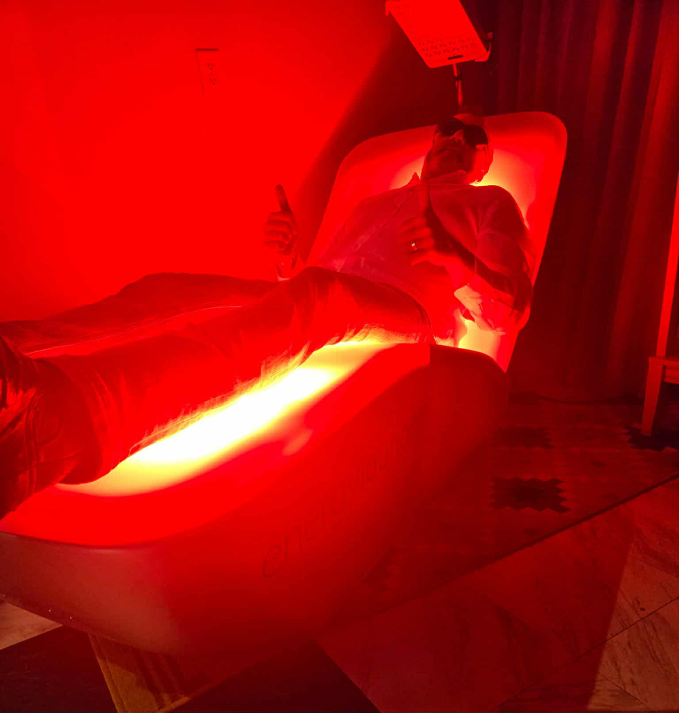 Our C60 Power team members are big believers in stacking their wellness routines. Here, our own Chas Herrin is using a Red-Light Lounger: